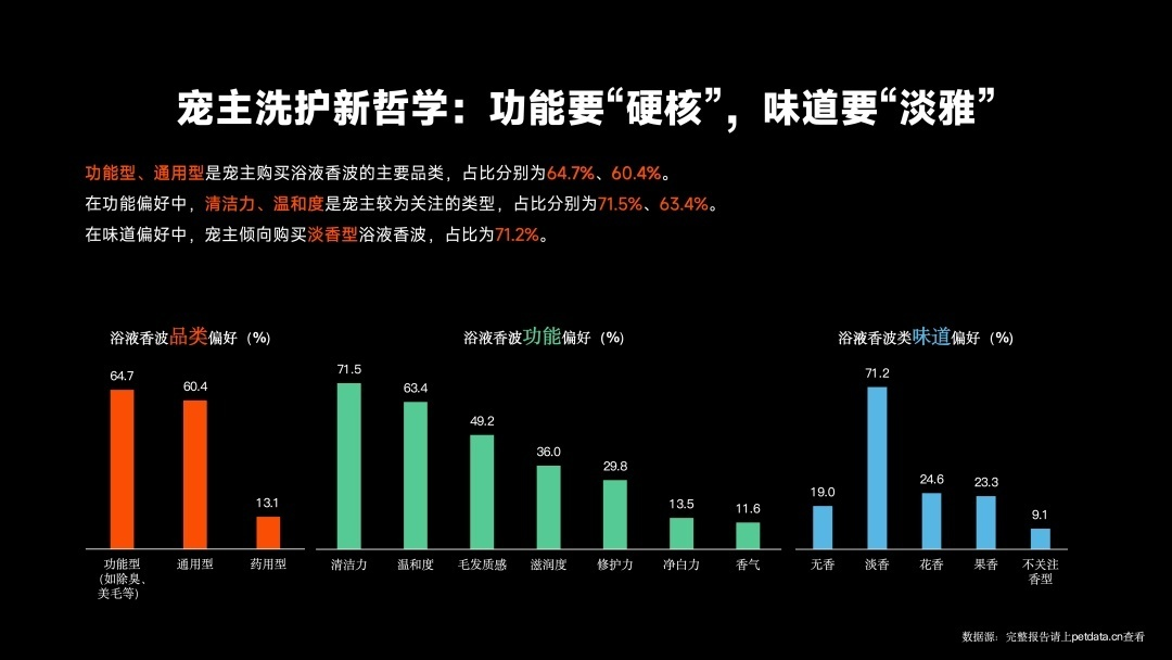 2、宠主洗护新哲学:功能要“硬核”,味道要“淡雅”。