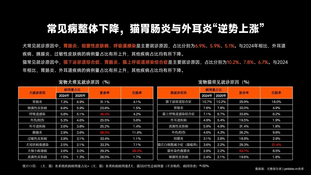2、常见病整体下降,猫胃肠炎与外耳炎“逆势上涨”。