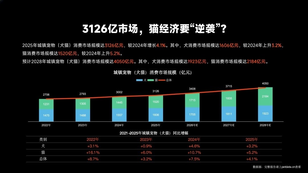 2025年城镇宠物(犬猫)消费市场规模达3126亿元,较2024年增长4.1%。其中,犬消费市场规模达1606亿元,较2024年上升3.2%,猫消费市场规模达1520亿元,较2024年上升5.2%。预计2028年城镇宠物(犬猫)消费市场规模达4050亿元。其中,犬消费市场规模达1923亿元,猫消费市场规模达2184亿元。