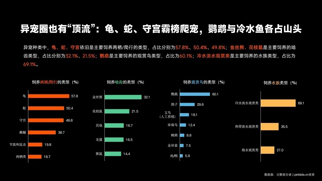 2、异宠圈也有“顶流”:龟、蛇、守宫霸榜爬宠,鹦鹉与冷水鱼各占山头。